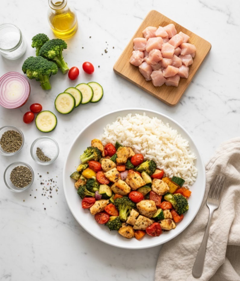 A high-protein, one-pan roasted chicken and veggie meal that comes together fast, tastes incredible, and works perfectly for dinner, meal prep, or clean eating. Tender chicken cubes roast alongside vibrant vegetables, lightly caramelized with olive oil, herbs, and smoked paprika.