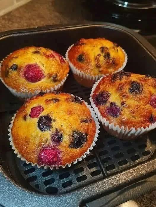 Soft, fluffy muffins bursting with juicy mixed berries and lightly golden on top. These air fryer muffins bake faster than oven muffins and come out perfectly moist inside with a slightly crisp top.