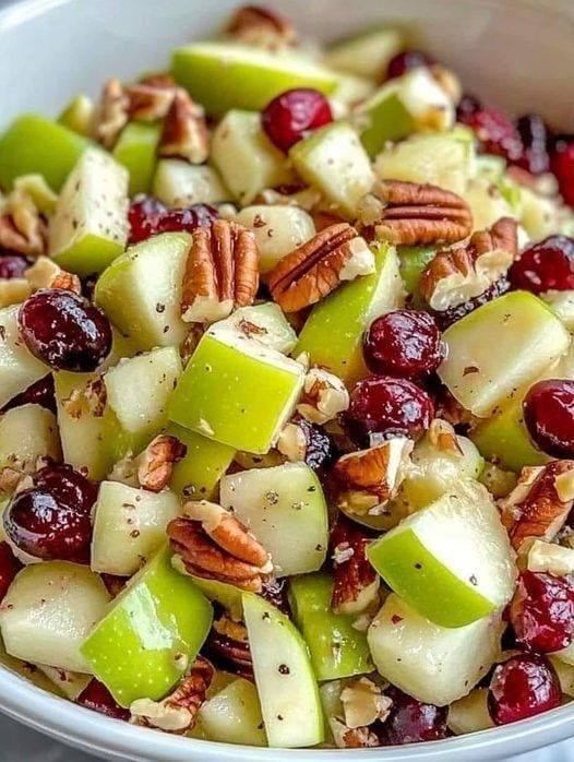 - Chop & Toss: In a large bowl, combine chopped apples, sliced celery, halved grapes, cranberries, and pecans.