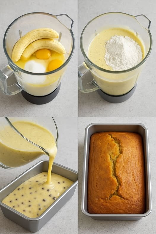 - In a blender, add the ripe bananas, eggs, sugar, oil, milk, and vanilla extract. Blend until smooth and well combined.