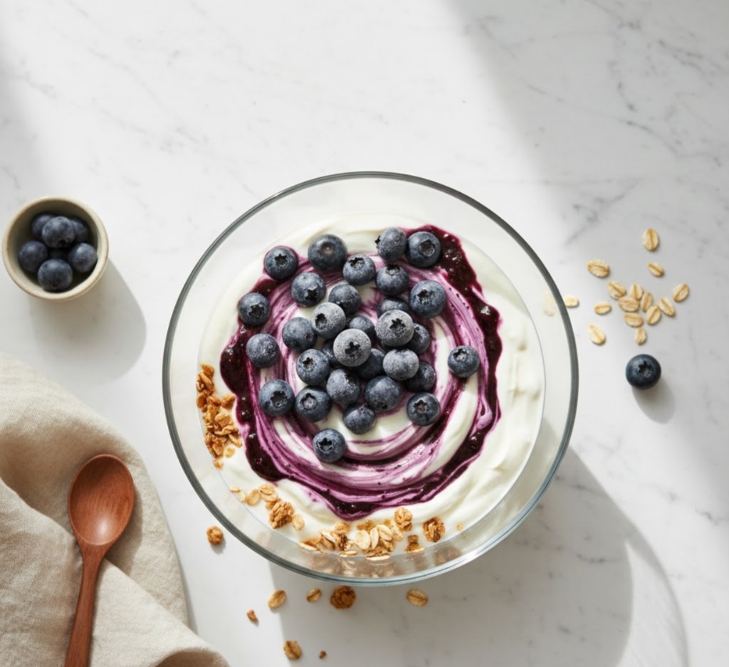 This Blueberry Swirl High-Protein Overnight Oats recipe is one of those breakfasts that feels a little too good to be healthy. Thick, creamy yogurt blended with vanilla protein powder sits on top of soft, cinnamon-spiced oats, finished with a glossy blueberry swirl that tastes like dessert. It’s cold, comforting, filling, and dangerously easy to overeat because every bite hits sweet, creamy, and fruity all at once.