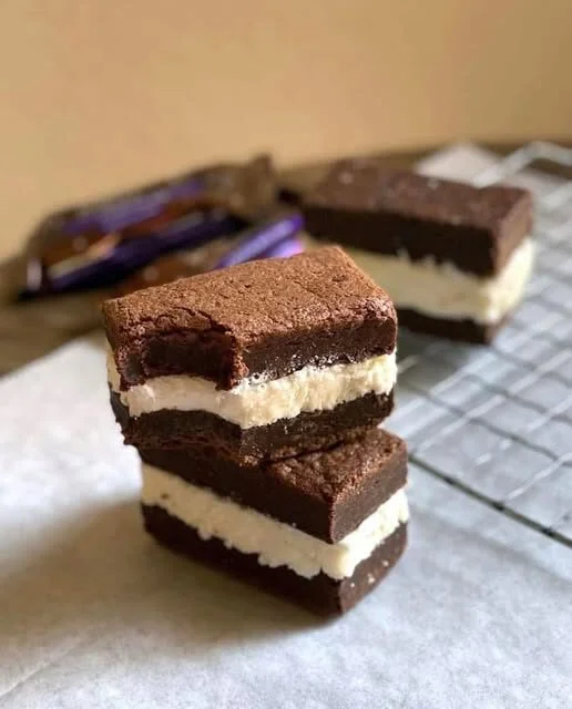 - Remove brownie from pan, cut in half. Spread whipped topping (mixed with protein powder, if using) over one half, then top with the other half.