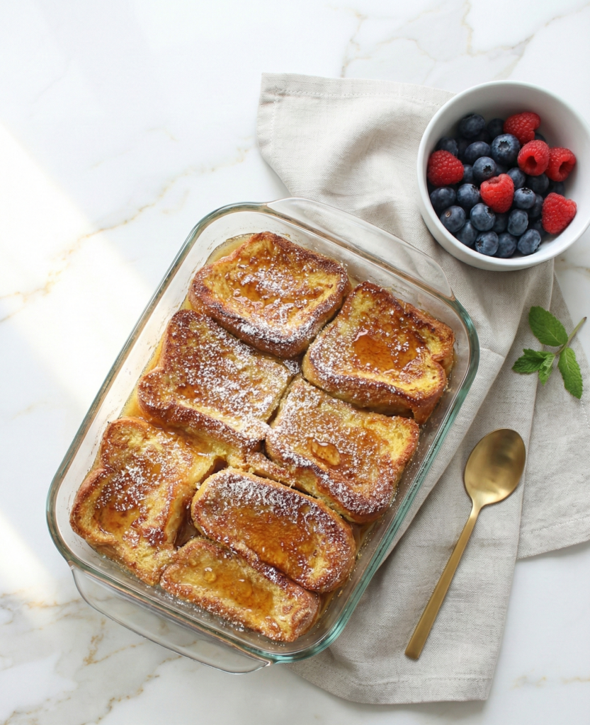 Golden, custardy slices of French bread baked in a rich brown sugar caramel sauce โ this overnight French toast casserole is a dreamy, crowd-pleasing breakfast.