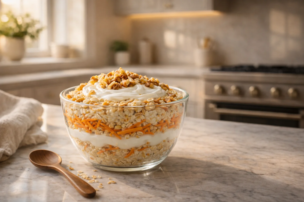 If you love carrot cake but want something healthier and easier, this recipe is perfect. It has all the warm flavors of a classic dessert but in a nutritious breakfast form.