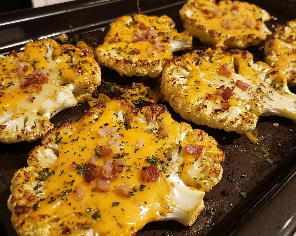 Plate the cauliflower steaks and garnish with additional parsley if desired. Serve immediately while hot and enjoy your delicious, low-carb alternative to baked potatoes!