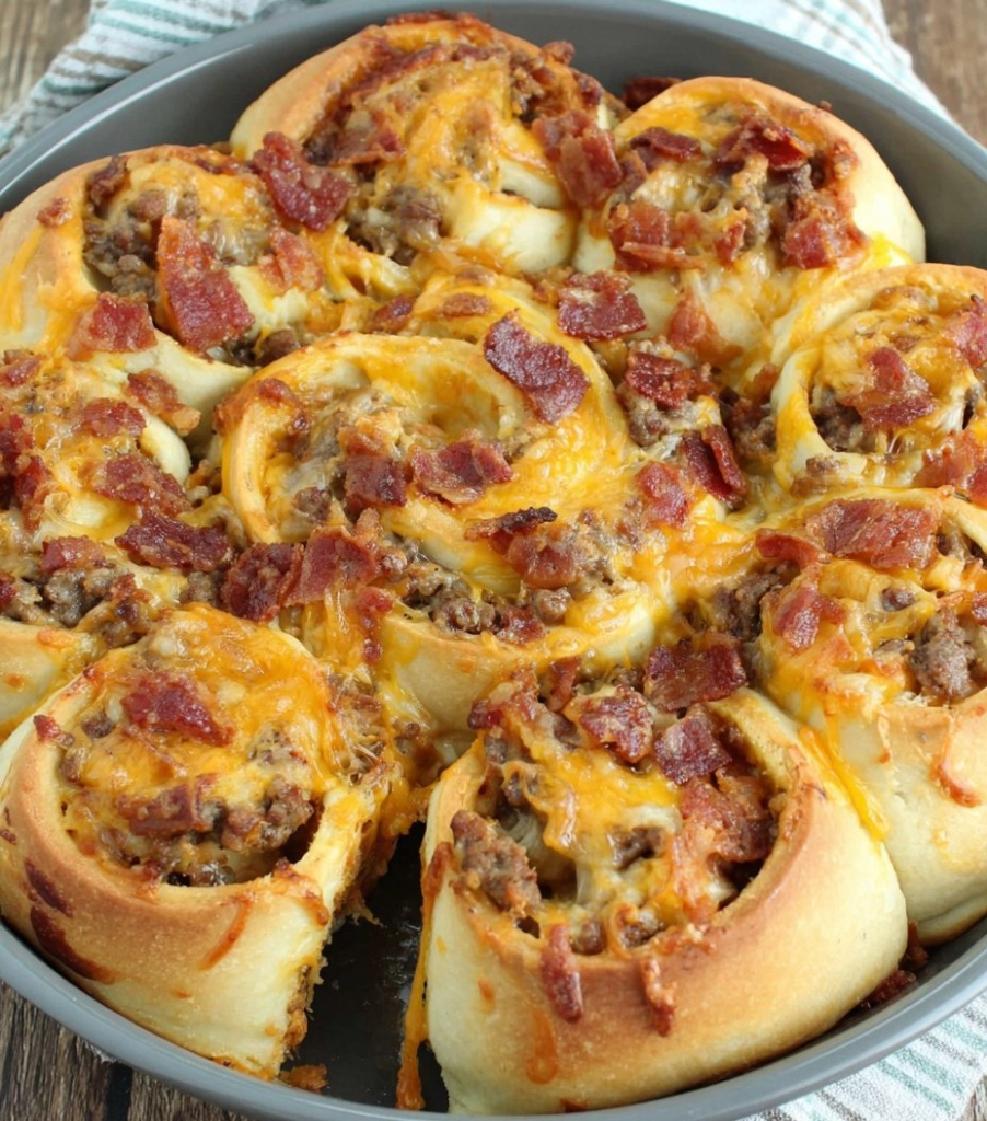 Cheesy Bacon & Sausage Pizza Rolls are soft, golden pizza dough rolled up with savory sausage, crispy bacon, rich marinara sauce, and loads of melted cheese. Baked until bubbly and irresistible, these rolls are perfect for game day, parties, or an easy family dinner everyone loves.