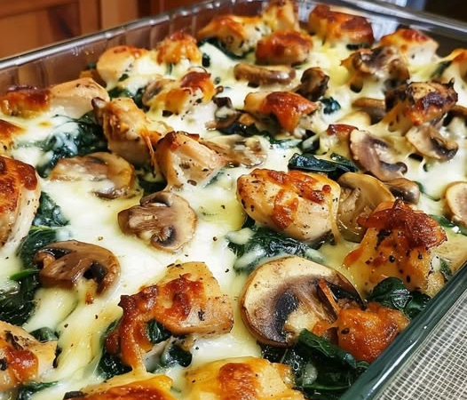 This Cheesy Chicken Spinach & Mushroom Bake is everything comfort food should beโrich, creamy, hearty, and deeply satisfyingโwhile still being protein-forward and easy to fit into a balanced lifestyle.