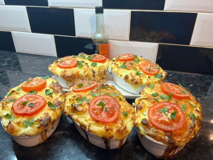 Individual servings of rich meat filling, creamy mashed potatoes, golden cheese topping, and fresh tomatoes — comfort food made cute.