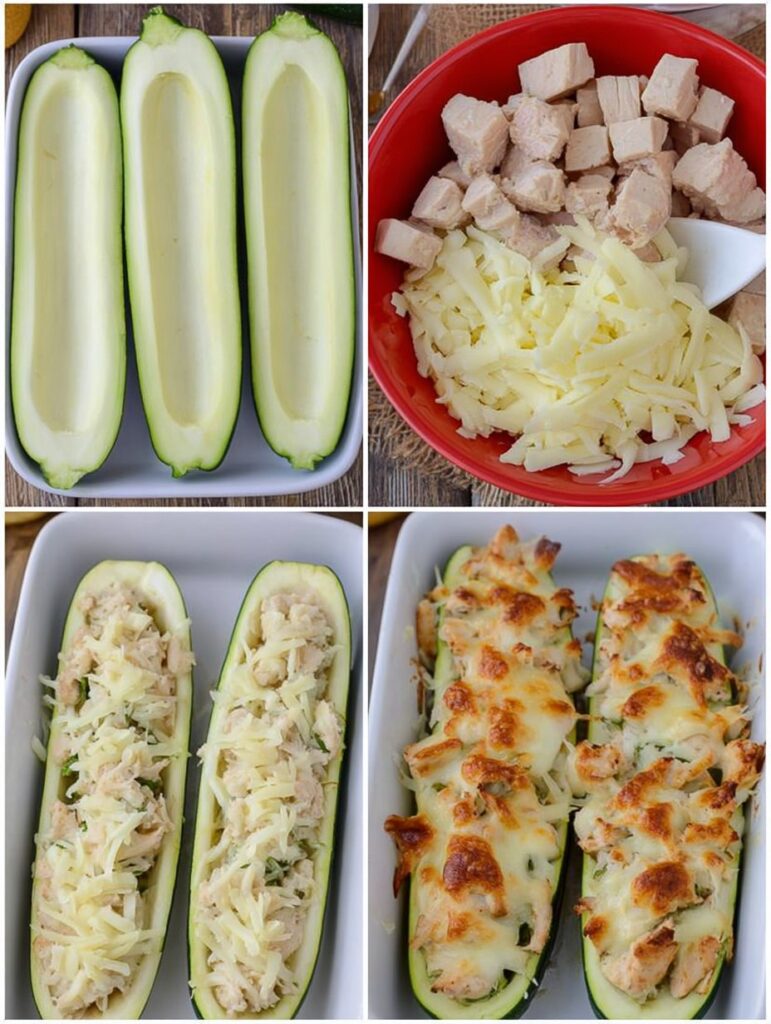 Cut zucchini in half and scoop out the center of each half to create boats. Place zucchini boats in a casserole dish.