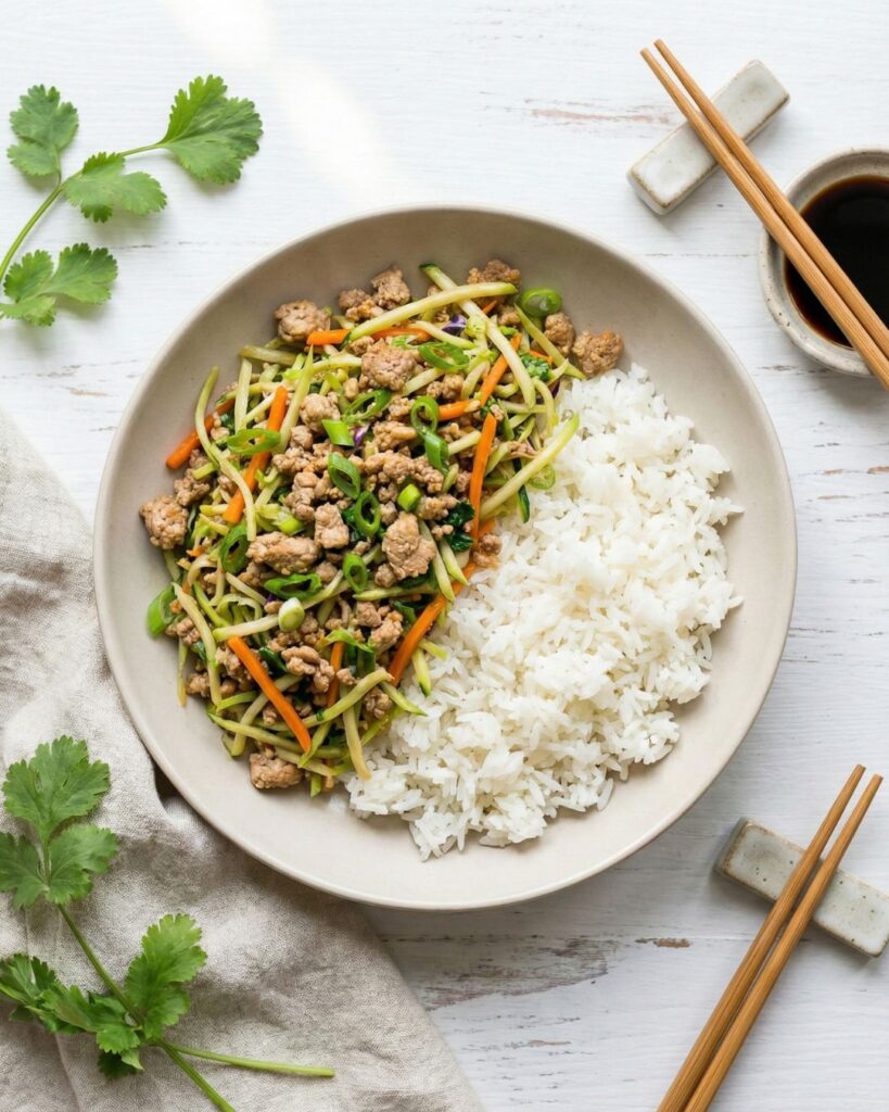 Lean ground chicken cooks with garlic, ginger, and soy sauce, then gets tossed with crunchy slaw mix and tender bok choy for that classic egg roll vibe. Served over rice, itโs a high-protein dinner thatโs comforting, filling, and easy to customize.