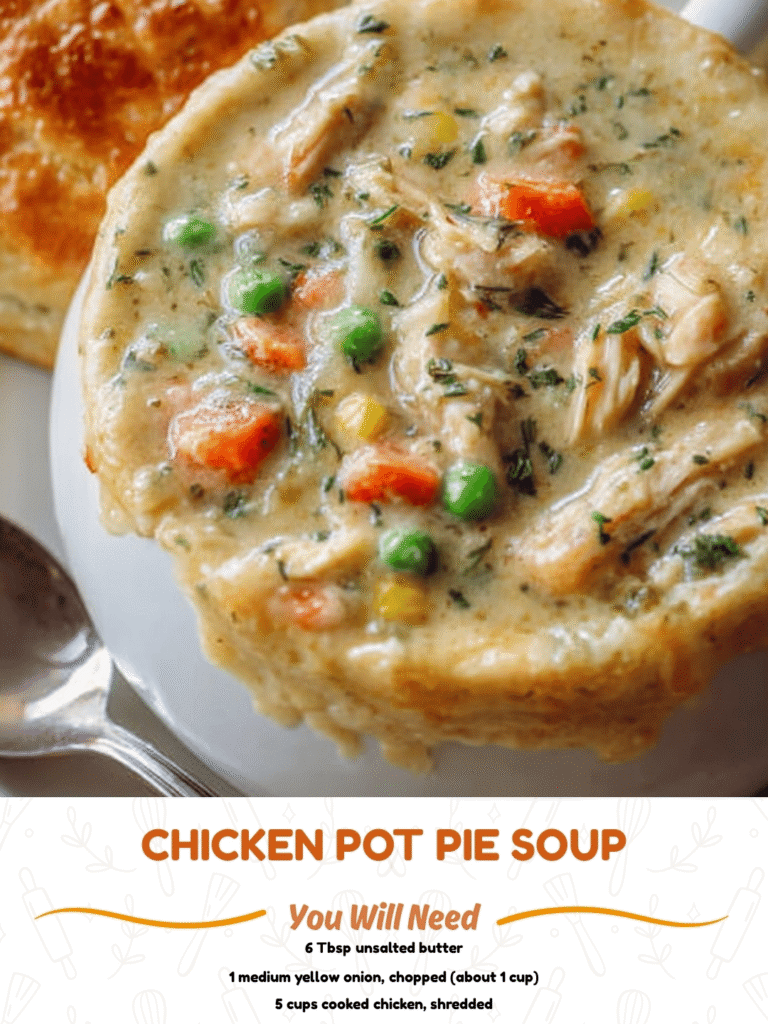 A creamy, comforting soup packed with shredded chicken, mixed vegetables, and a savory broth. This Chicken Pot Pie Soup brings all the delicious flavors of the classic chicken pot pie into a hearty, cozy bowl.