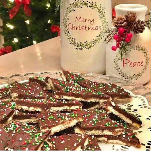 A crisp, buttery cracker toffee layered with melted chocolate and festive sprinkles—an easy holiday treat perfect for gifting and sharing.