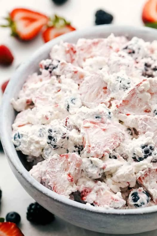 This image shows a rich, creamy frozen fruit salad with visible chunks of strawberries and blueberries folded into a soft, whipped cream-cheese base. The texture looks fluffy yet dense, with a pale pink-and-white color that signals a chilled, mousse-like consistency rather than an icy one. Itโs the kind of old-fashioned dessert thatโs served cold, scooped or sliced, and always feels nostalgic, refreshing, and comforting.