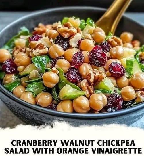 In a large bowl, combine chickpeas, cranberries, walnuts, cucumber (or celery), onions, and parsley. -