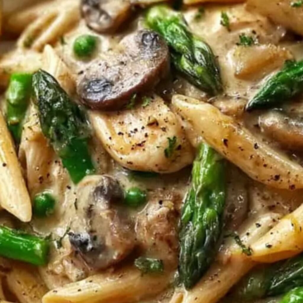 - Flavor: Garlic-infused cream, earthy mushrooms, savory chicken, and bright asparagus.