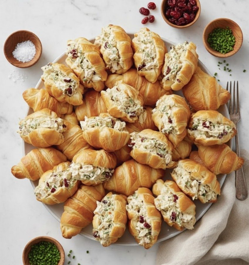 These are soft, buttery croissants filled with creamy chicken salad—perfect for brunch, parties, or make-ahead lunches. Exactly like the image: fluffy croissants generously stuffed and irresistible.