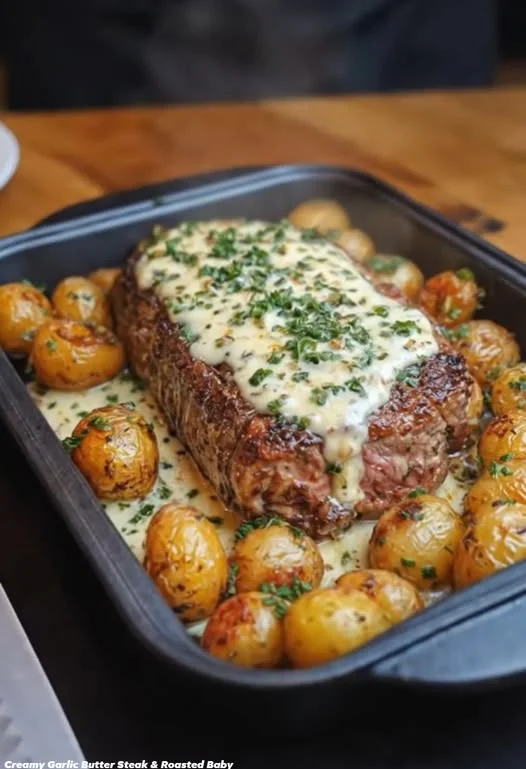 A rich and satisfying dish featuring juicy seared steak smothered in a creamy garlic butter sauce, paired with crispy roasted baby potatoes. Perfect for a restaurant-style dinner at home.