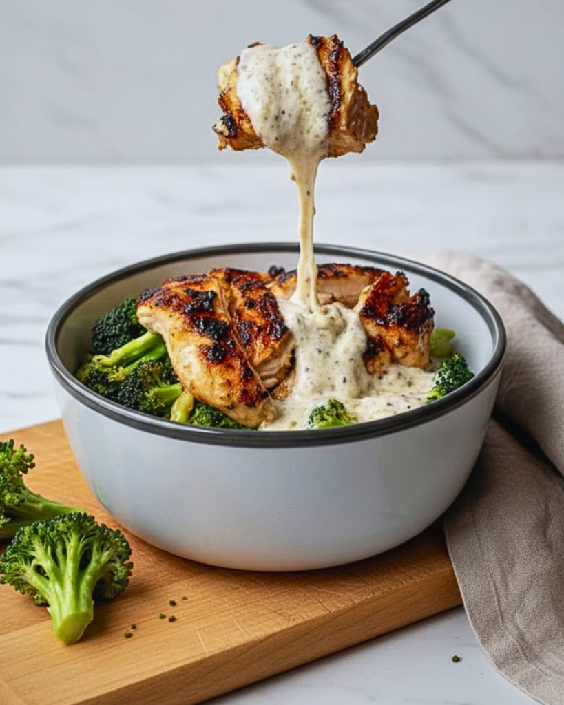 Divide rice or quinoa between bowls. Top with chicken and broccoli. Drizzle generously with creamy garlic sauce.