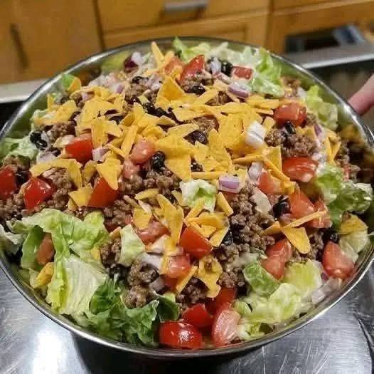 This dish comes together right before serving. Warm taco beef meets cool lettuce, fresh toppings, and crunchy chips for contrast in every bite.