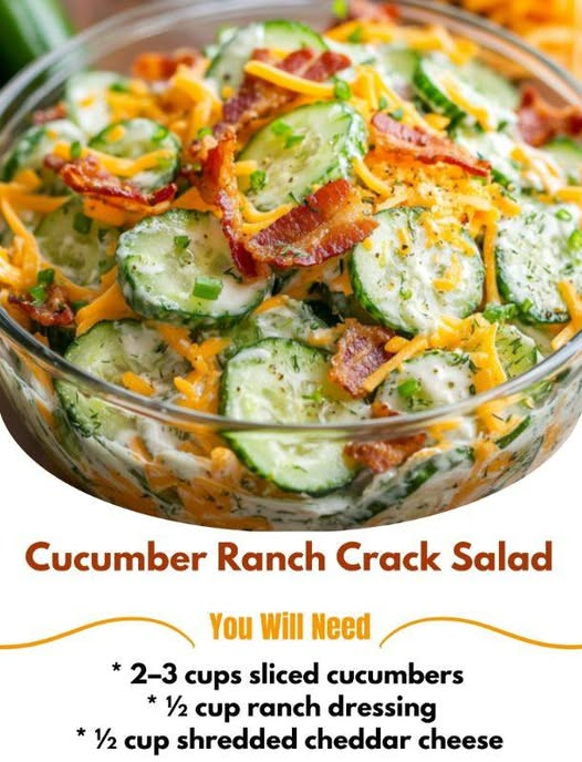 This salad has become a viral favorite because it takes the humble cucumber and turns it into something irresistible. Ranch brings creaminess, cheddar adds a sharp bite, and bacon delivers smoky crunch. Together, the trio creates a side dish that disappears from the table in minutes.