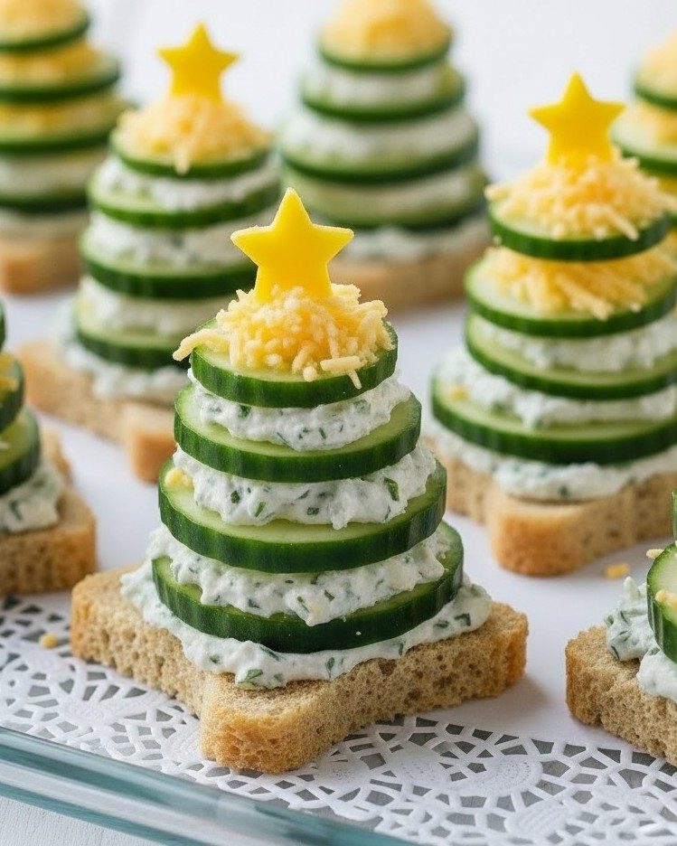 Festive cucumber “Christmas trees” layered with herbed cream cheese and crisp vegetables—an adorable, refreshing holiday appetizer that’s light, colorful, and crowd-pleasing.