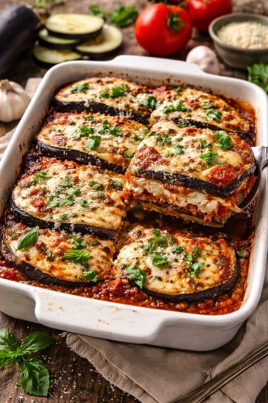 - Layer eggplant slices, cheese mixture, then sauce. Repeat layers until ingredients are used, ending with a layer of sauce.