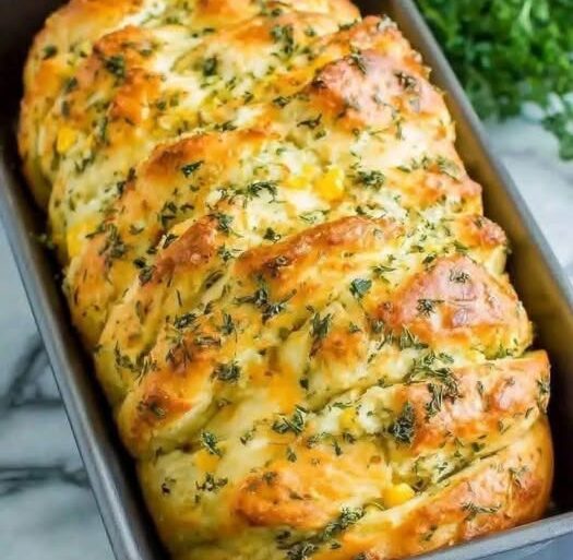 Divide dough into 7–8 pieces. Roll each into an oval, spread with garlic butter, fold in half, and place open-side up in a greased loaf pan. -