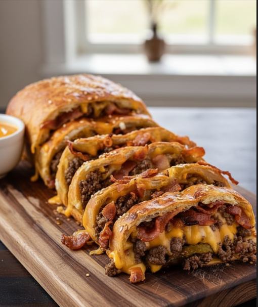 A cheesy, meaty, flavor-packed roll that combines the best of a bacon cheeseburger and a calzone. This stuffed bread is golden on the outside, gooey on the inside, and perfect for dipping. It’s comfort food at its finest—great for game day, parties, or an easy weeknight meal.