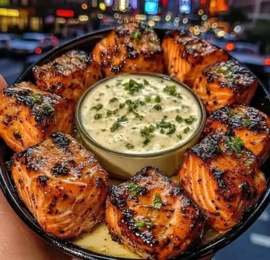 Juicy, crispy-edged salmon cubes seared in garlic butter and served with a creamy herb sauce. High-protein, low-carb, and perfect as an appetizer or main dish.