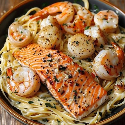 This rich, buttery seafood pasta combines succulent salmon, juicy shrimp, and creamy garlic parmesan sauce over a bed of linguine. It’s an easy, restaurant-quality dish perfect for special dinners!