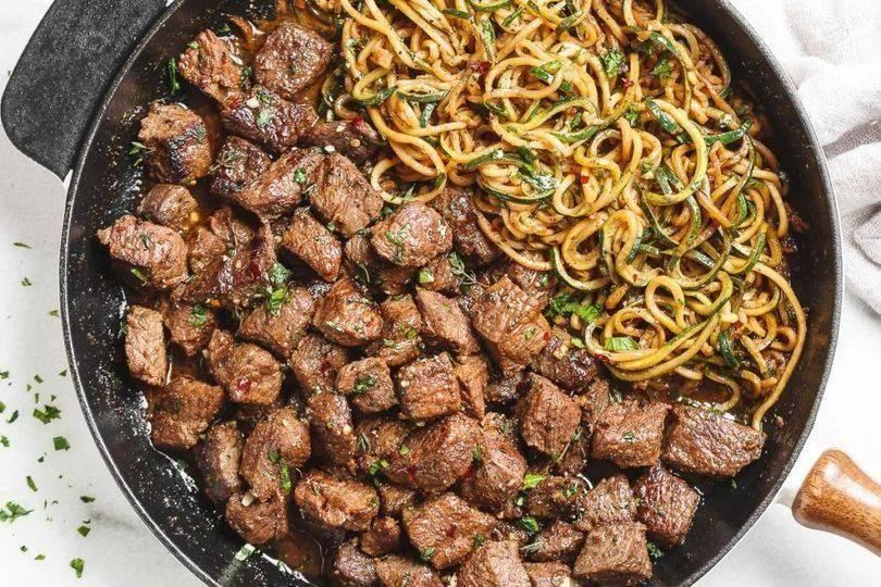 - Place zoodles on plates, top with steak bites, drizzle pan juices over everything. Garnish with parsley.