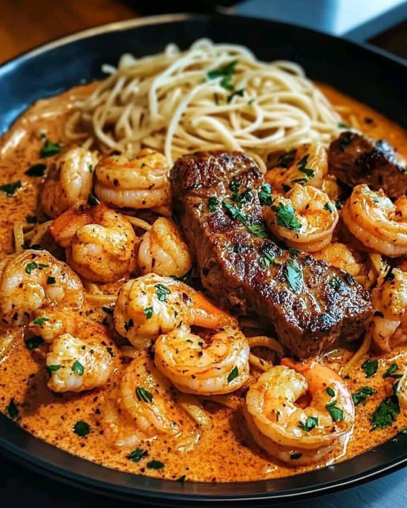 Return steak and shrimp to the pan. Toss gently until everything is heated through and well combined.