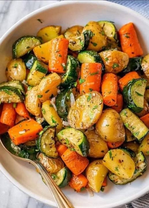 - In a large mixing bowl, combine the potatoes, carrots, and zucchini.