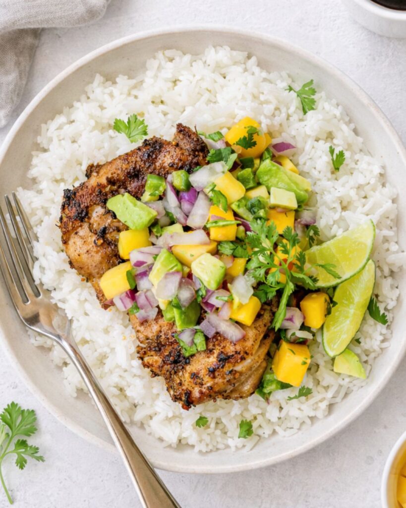 The chicken is marinated in classic jerk seasoning with garlic and a touch of sweetness, then grilled until charred and tender. Topped with mango, avocado, lime, and cilantro, this becomes a high-protein dinner that feels exciting, fresh, and satisfyingโwithout being heavy.
