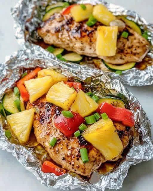 Juicy chicken breasts baked in foil with pineapple, peppers, zucchini, and a sweet-savory Hawaiian glaze.