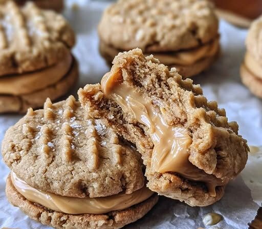 These soft peanut butter sandwich cookies have a tender oat texture and a creamy peanut butter yogurt filling that slowly melts in the center just like in the image. The cookies are lightly sweet, rich in peanut butter flavor, and incredibly satisfying without needing to bake.