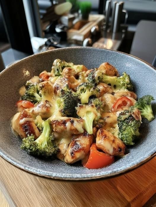 This dish is packed with protein, loaded with tender chicken and broccoli, and finished with a creamy, cheesy sauce that feels indulgent but fits a high-protein lifestyle perfectly.