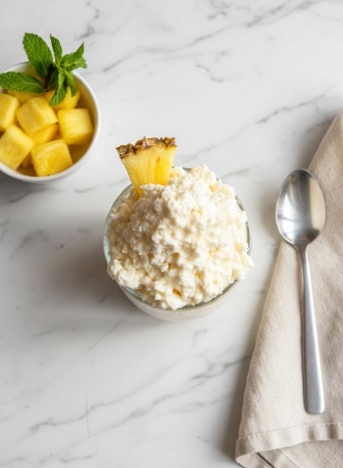 This is a high-protein remake of that classic Hawaiian-style pineapple fluff—same nostalgic tropical flavor, but upgraded to keep it filling, balanced, and protein-rich. It’s light, creamy, slightly tangy, and perfect as a dessert or a protein snack.