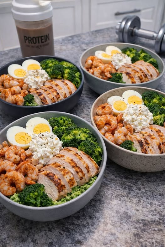 This bowl brings together juicy chicken, tender shrimp, protein-packed eggs, creamy cottage cheese, and two forms of broccoli for maximum volume and nutrition without heaviness.