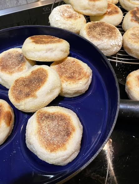 Heat a dry skillet or griddle over low heat. Cook muffins 6โ8 minutes per side until deeply golden and cooked through. Keep heat low so they cook inside without burning.