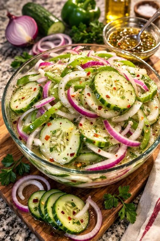 This is one of those simple homemade salads that never gets boring. It is fresh, crunchy, and full of bright flavors that make it perfect for hot days or when you want something light but still satisfying. The mix of vinegar, herbs, and a little sweetness brings everything together in a way that keeps you coming back for another bite.