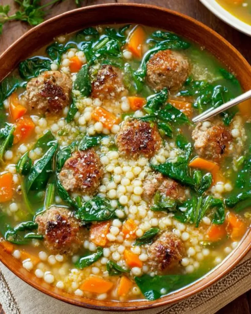 Homemade Italian Wedding Soup is a cozy, flavor-packed family favorite with tender meatballs, acini di pepe pasta, and wilted spinach in savory golden broth.