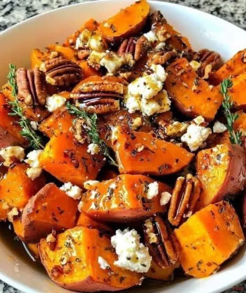 Enjoy your delicious Honey Roasted Sweet Potatoes with Feta & Pecans!
