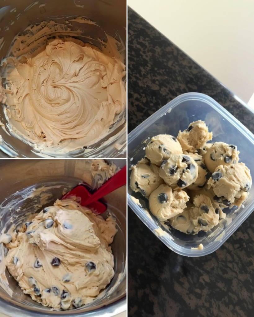 In a mixing bowl, whip the softened butter and cream cheese together using a hand mixer or stand mixer until smooth, fluffy, and well combined. This step is key for a creamy, authentic cookie-dough texture. -