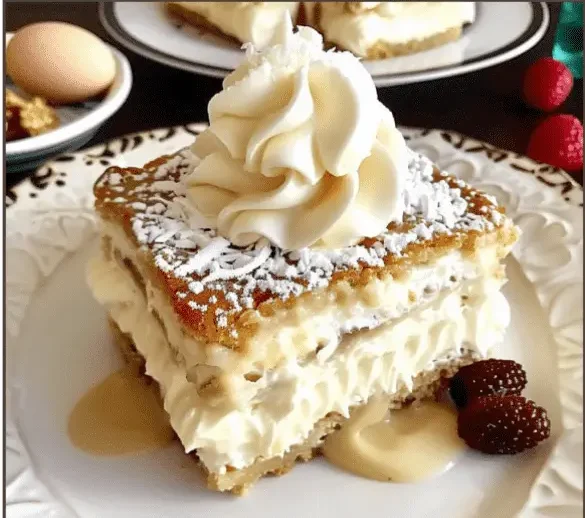 - After an hour, slice the chilled Keto Cream Puff Cake & serve!