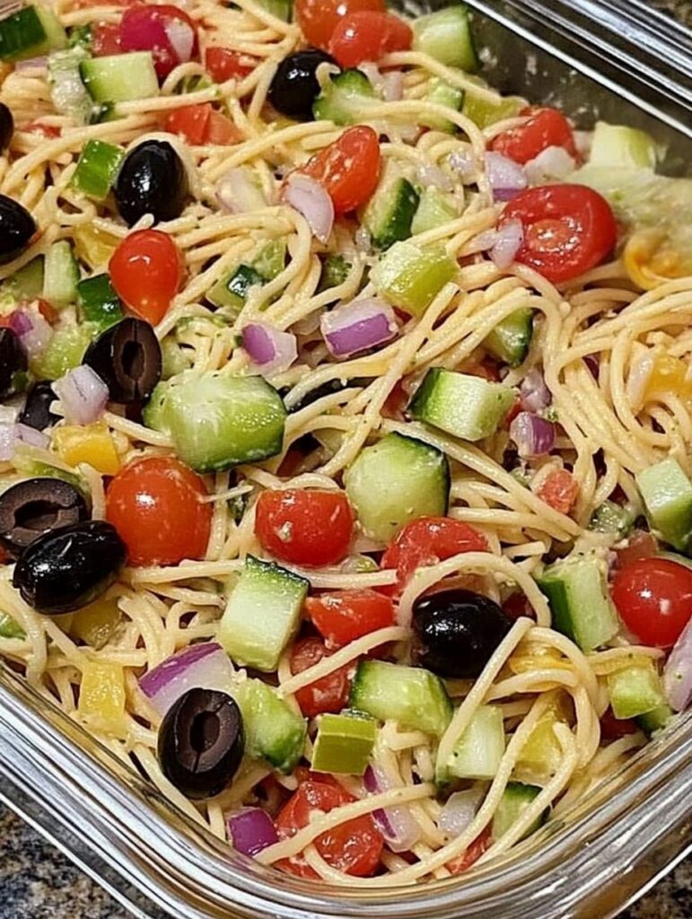 - Combine the noodles, red onions, cucumber, black olives and tomatoes in a separate bowl.