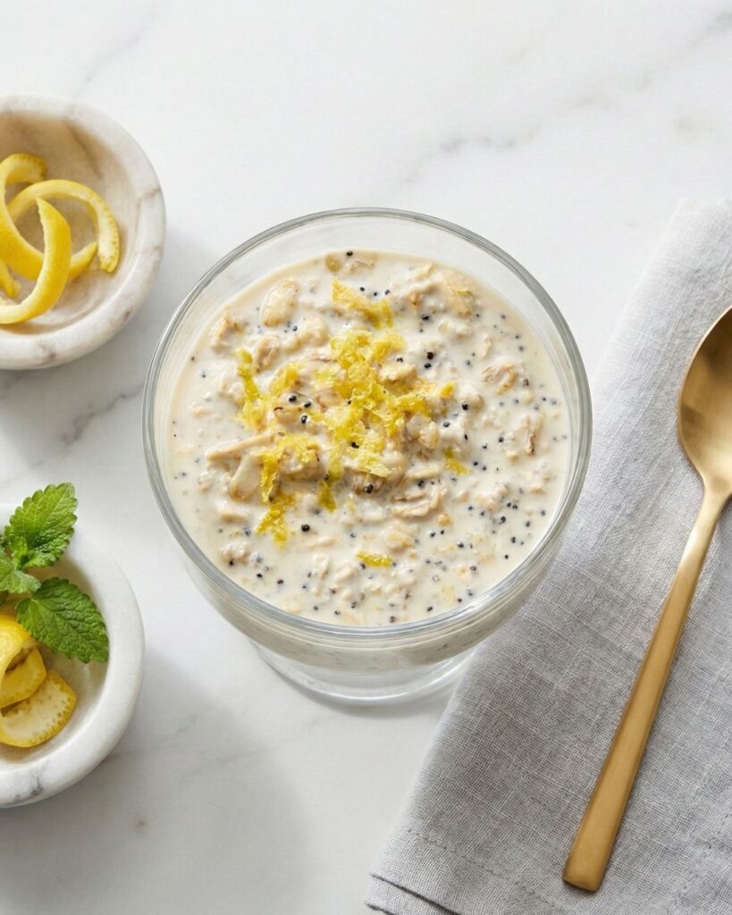Made with rolled oats, Greek yogurt, and milk, this recipe delivers steady energy and satisfying protein while staying simple and meal-prep friendly. The lemon zest adds freshness without overpowering, and the poppy seeds give just the right amount of texture.