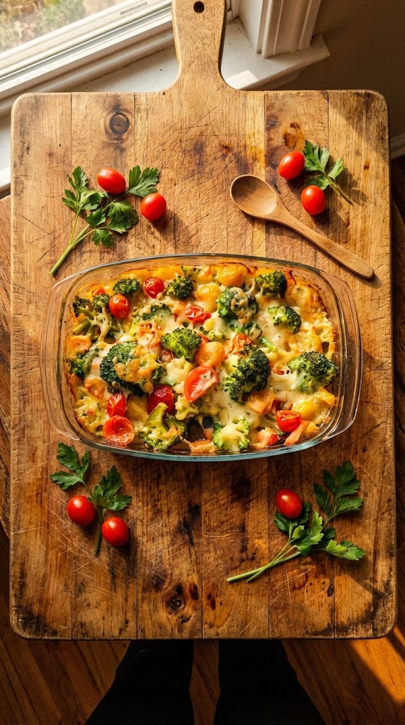 Combine Ingredients: In a large bowl, mix together the broccoli, sautéed vegetables, halved tomatoes, low-fat mozzarella, low-fat cottage cheese, and skim milk. Add salt, pepper, dried oregano, and dried basil, stirring until well combined.