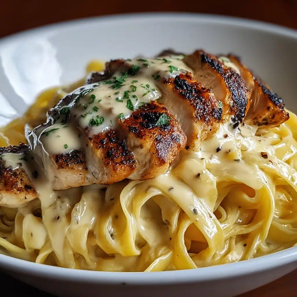 A lighter, low-carb twist on classic buttered noodles—tender seared chicken served over silky, garlic-butter low-carb fettuccine.