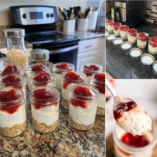 These no-bake strawberry cheesecake jars are creamy, light, and perfectly layered with a buttery crumb base, rich vanilla cheesecake filling, and sweet strawberry topping. They look impressive but are incredibly easy to prepare. No oven needed โ just chill and enjoy.